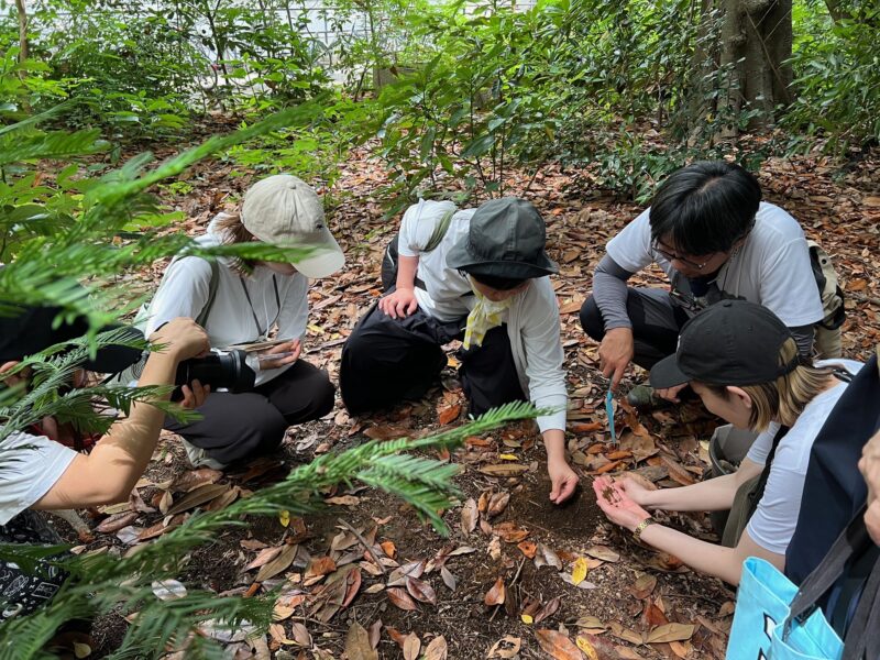 「東京藝術大学の教員・君塚和香さんの案内で、キャンパス内の森を探検!人々の手で守られてきた豊かな植生に目を向けながら、東京都美術館の「大地に耳をすます 気配と手ざわり」展の出品作家 ふるさかはるかさんと一緒に作品鑑賞や自然素材を使って木版画を作ります。よくみて、手を動かして、「自然と共に作ること」について考えるプログラムです。」