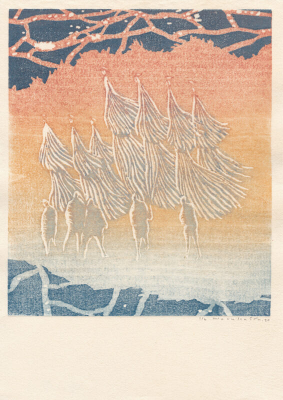 南津軽で始まった山の手仕事の取材が、6年の歳月を経て本になった。山の命と直接関わるマタギ(猟師)やソマ(木こり)や漆掻き(樹液を採集する人)は、冬の厳しい北国で動植物からどんなサインを読み取り、どう自然とやりとりするのか。山のことばに導かれ、取材地をたずね歩いて記録した。 そうたずね歩くうち、藍と漆とヒバと土とが私の手元に託された。山のことばと素材に呼応し、私も彼らの手振りをまねび木版画を作りたい。ヒバの香を嗅ぎ、藍の葉が青に変わるのを見、漆にかぶれるのを肌で覚えながら、山の命と関わる手段を引き寄せるために。(ふるさかはるか)